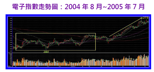 2004年~2005年新台幣第一次大幅升值期間,「電子指數」從8月初時的低點206點,上漲到8月底的高點229點,之後便展開一波長達半年的區間震盪(200點~235點),隨後2005年,在新興市場需求崛起的帶動下,全球景氣快速復甦,「電子指數」也再度展開一波多頭行情,2005年7月來到最高點的273點。