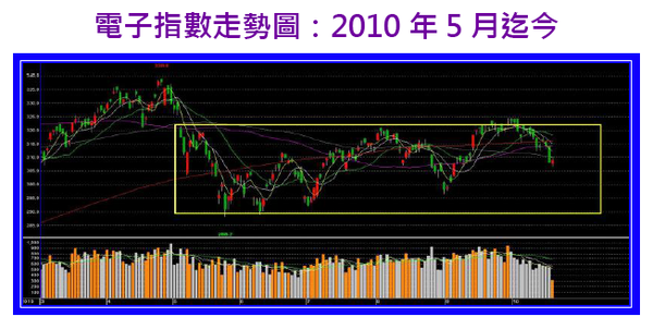 整體而言,儘管九月份以來,「電子指數」在新台幣急升的影響下,自十月份的高點324點,回檔到最低的306點(10/19),但若將時間拉長來看,其實「電子指數」仍然不脫今年五月份以來290~322點的整理格局,因此換言之,近期新台幣匯率的急升,充其量只是給「電子指數」由高點壓回的理由,但從中長線的走勢來研判,這個壓回仍在整理區間的範圍,絲毫沒有改變長期趨勢的架構。