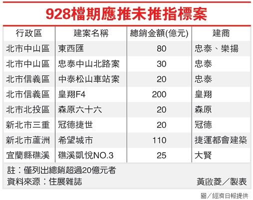 據統計,928檔原本應推的指標建案為33個、但如今已有13個指標案延後登場,總量體也縮減五成,最具指標的是台北市信義計劃區的新成屋豪宅案「皇翔F4」。