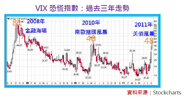 2008年金融海繡的陰影猶存,影響所及就是當2010年南歐豬國(PIGS, Portugal、Italy、Greece、Spain)發生債務問題,與2011年美債遭降評等突然其來降臨時,全球的投資人有如「驚弓之鳥」,不但造成VIX恐慌指數大幅上揚,甚至演變成今年8、9月的全球股災。
