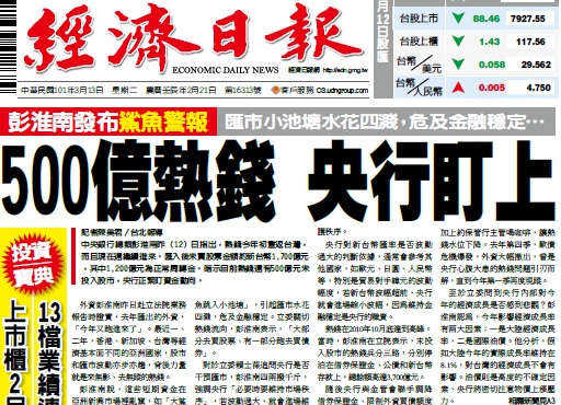中央銀行總裁彭淮南昨(12)日指出,熱錢今年初重返台灣,而且現在還繼續進來。匯入後未買股票金額約新台幣1,700億元,其中1,200億元為正常周轉金。暗示目前熱錢還有500億元未投入股市,央行正緊盯資金動向。