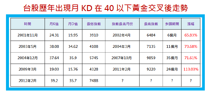 另外,月KD的黃金交叉也可以運用在台股大盤的推測上,從技術分析的觀點來看,當台股出現月KD在40以下出現「黃金交叉」的發展,確實相當有利於後續的多頭走勢。