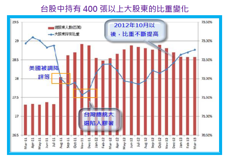 下圖為台股在2013年3月底時,總股東人數與持有400張以上大股東比重的一覽表,紅色柱狀代表總股東人數,藍色折線代表大股東持有比重。