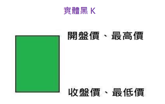 其中,沒有上下影線的黑K,在技術分析中稱之為:實體黑K,也就是「開盤價=最高價、收盤價=最低價」,在一般技術分析的教科書中,實體黑K所隱含的意義為:下跌力道猛烈,後市還有低點,通常實體黑K最常出現在波段跌勢中,若出現在波勢漲勢上,則隱含未來漲勢即將結束,盤勢將反轉的意味。