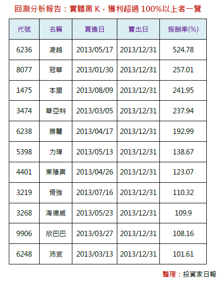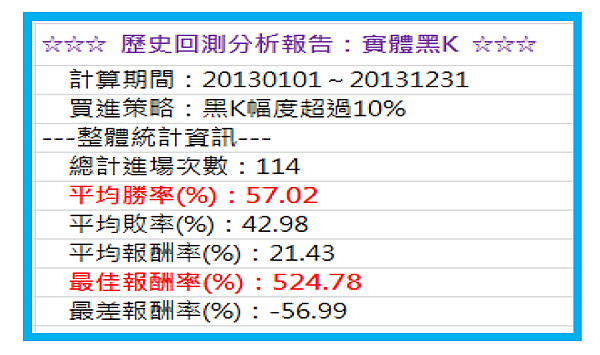 慶龍先以2013年為計算期間,進行了電腦模擬的回測統計,只要個股當天的K線,出現幅度超過10%的黑K棒,就以逆市場的思維來買進,測試結果會如何?