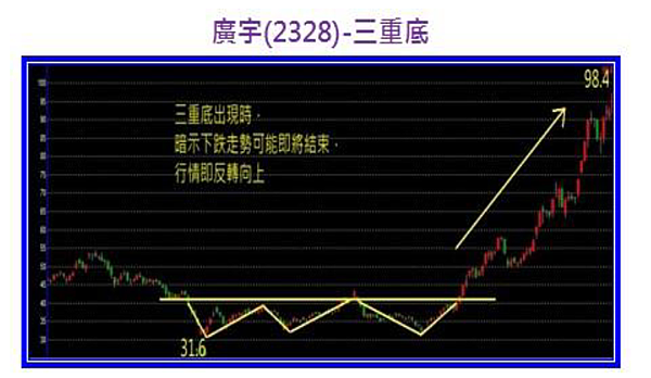 標準的三重底,是由三個低點所構成,也就是股價在跌勢末端進行上下震盪時,三次下跌到大約相同的價位即獲得支撐而反彈後,在K線圖中形成的一個底部反轉型態。當「三重底」形成時,通常暗示波段下跌走勢可能即將結束,一旦股價突破三重底頸線,行情便有很高的機會反轉向上。下圖廣宇(2328)即為三重底出現後,行情由波段下跌反轉向上的例子。