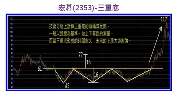 一般而言,三重底形成後的漲幅滿足點參考價,也同樣是以頸線為基準,來做上下等距的測量,以宏碁(2353)為例,三重底最低點45元,頸線約61元,因此漲幅滿足點的參考價為61+(61-45)=77元。