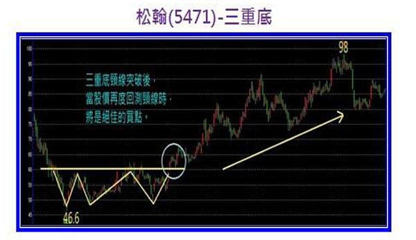 除此之外,三重底的頸線突破後,未來當股價有回測頸線的機會時,通常被視為絕佳的買點,例如下圖的松翰(5471),就是出現突破三重底,股價一度回測頸線獲得支撐後,隨即向上走揚的例子。