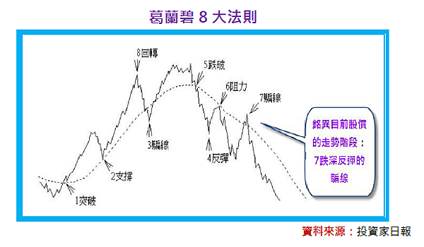 第一、目前銘異(3060)股價的位階,正處於葛蘭碧8大法則的第7階段:跌深反彈的騙線。