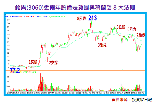 葛蘭碧8大法則的內容,幾乎完全複製在近兩年銘異的股價與60日移動平均線(綠色曲線)關係變化上,另外,由於2014年11月已進入到第7階段,因此可解釋銘異(3060)的股價為何會出現強勁的跌深反彈。