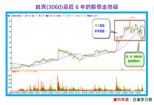 第二,2014年11月時的銘異(3060),短中長期均線已呈現空頭排列走勢。