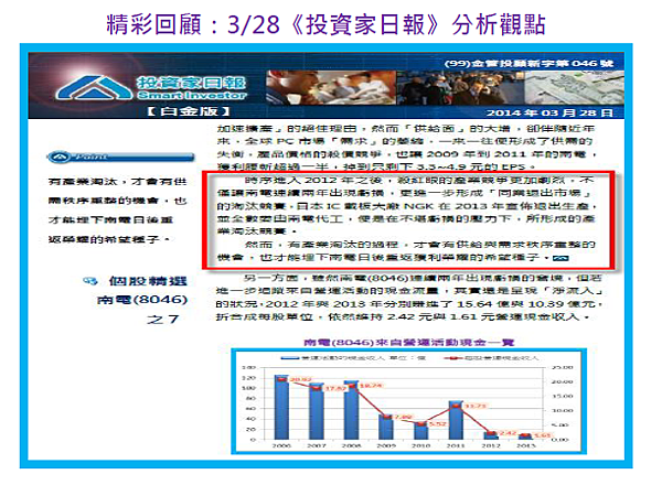 此外,2012年以來,雖然殺紅眼的產業競爭加劇,讓南電(8046)連續兩年出現帳面的虧損,但「同業退出市場」的淘汰過程(日本IC載板大廠NGK在2013年宣佈退出生產,並全數委由南電代工),不僅讓IC載板的「供給」與「需求」有重新恢復秩序的機會,更埋下南電(8046)日後重返獲利榮耀的希望。