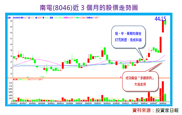 隨著近日南電(8046)的股價,連續兩天出現漲停板的走勢,加上先前短、中、長期均線已在37元完成糾結,換言之,接下來持股訂戶可以期待的發展,就是南電的股價,將有機會正式進入到「營運重返榮耀」的正向循環,並發展成技術分析中,短中長期均線「多頭排列」的大漲格局。