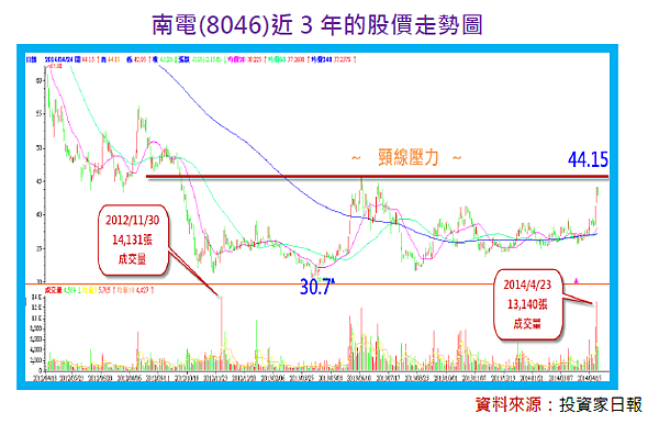 不過,從成交量的發展,確實有透漏,未來可以成功化解頸線壓力的意味,因為4/23當天已看到13,140張的成交量,由於這是南電從154元高點下跌以來,僅次於2012年11/30日14,131張的第2大成交量,因此從「量比價先行」的概念,以及目前的產業趨勢發展,南電(8046)的股價突破頸線壓力,並持續往每股淨值53元邁進,將只是時間早晚的問題。