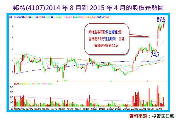 以慶龍長期追蹤的生技股邦特(4107)為例,4/1發布了每股現金減資2元的訊息,並搭配原有2.1元的現金股利,在合計每股高達4.1元的現金收益下,立刻激勵股價連番大漲17%,一路從74.7元上揚到87.5元。