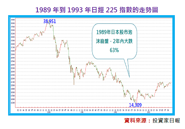 回顧1989年時的日本,當時不僅日本企業在國際上賺進了大量的外匯,更推升了國內股市與房地產一路狂升的榮景,全盛時期光是日本東京的房地產市值,便可買下整個美國,然而,好景不長,日本房地產在1989年達到最高峰時,便開始出現資產泡沫的危機,而大量銀行放款變呆債的轉變,不僅衝擊日本銀行體系瀕臨破產,更讓日本股市出現一瀉千里的崩盤,2年內一路從最高38,951下跌到14,309,波段跌幅高達63%。