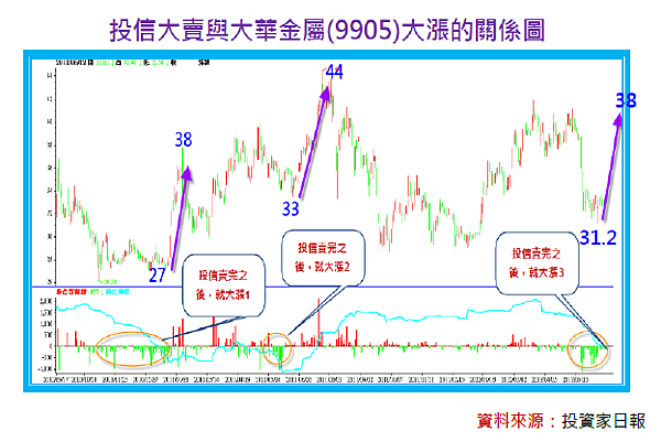 2010年10月底,投信開始大賣大華金屬的股票,庫存一路從2.1萬張大減到隔年1月中的9,300餘張,投信賣壓的大舉出籠,雖然造成大華金屬的股價從31元下跌到27元附近,但投信賣完之後就大漲1的狀況,短短一個月內股價就從27元彈升到38元,波段漲幅約40%。