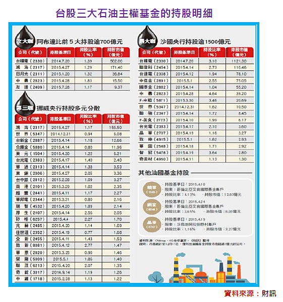 至於另一個來自北歐的主權基金挪威,由於持股較多元與分散,加上總金額預估不到200億元台幣,因此對台股的影響衝擊較少,不過2015年年初挪威央行行長奧爾森曾暗示表示,60美元的油價,將會是主權基金「賣股求現」的觀察指標。