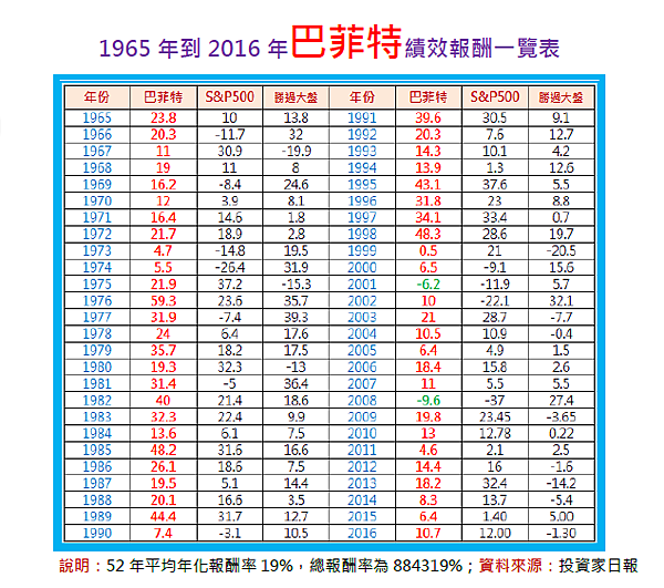 既然短期致富的想法不切實際,那麼多少的投資報酬率才是合理的預期?美國股神巴菲特的經驗,或許可提供參考,追蹤1965年到2016年合計長達52年的統計期間,巴菲特在股票投資的年複合報酬率雖然僅為19%,但僅憑這樣的報酬率,就足以讓原本10萬元的資產,增長到8.8億元,100萬元的資產,成長到88億元。