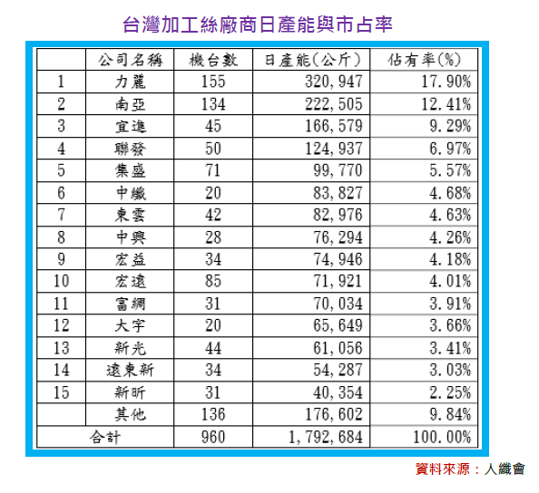 聚酯加工絲為紡織業上游的主要原料,透過假撚加工原絲的方式,製作成仿絲、仿棉、仿毛的合成纖維,由於具備易洗、快乾、免燙、色澤亮麗、伸縮性好、手感佳等特性,因此應用的範圍包括:休閒運動服、襪子、手套、西裝襯衫、地毯、雨棚、輪胎簾布、安全氣囊….等等。