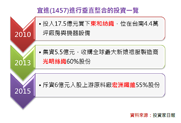 關於上中下游的垂直整合,先是分別在2010及2011年投入8.5億及9億台幣,買下上游原料廠商東和紡織(1414),位在台南高達4萬4千坪土地的廠房與機器設備,2013年再集資以5.5億元的價格,收購全球最大新娘禮服製造商光明(4420)60%的股份,2015年則斥資6億元,籌資入股上游原料廠宏洲纖維(1413)55%的股份,而這三筆投資更是近幾年台灣紡織業少數的國內重大投資。