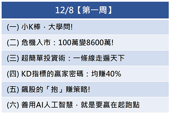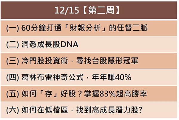 【說明】:此線上影音課程,為2018年12/8與12/15的上課錄影,課程時間合計8小時,從技術分析、財報解析、到產業透析,一次學會攻守兼備的投資策略!