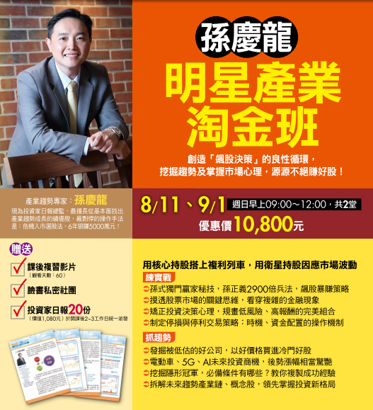 有鑑於此,慶龍將與《Smart致富月刊》在8/11與9/1開設新課程【明星產業淘金班】,此課程一方面是進階班的內容,並多加籌碼分析的學習教材,另一方面則更強調融會貫通的分析架構,相信來上課的學員,將會有更多有用的實戰體驗。