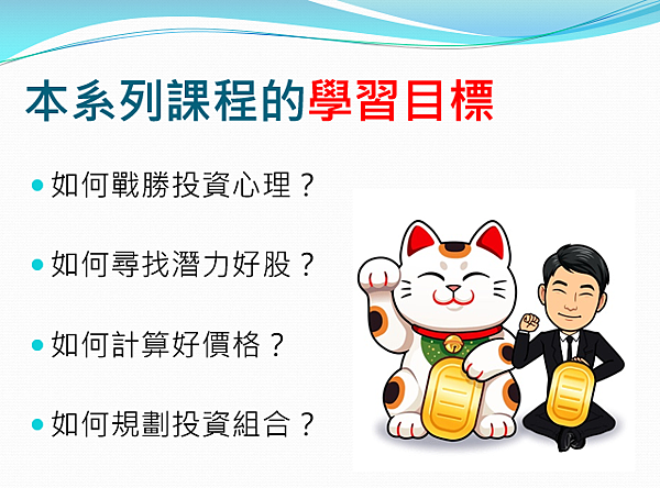 本系列課程學習的目標有以下四點,而8/11課程重心除了放在戰勝投資心理之外,更重要的是教導學員精準計算「好價格」,掌握「買低賣高」的實戰技巧,得以更從容地面對金融市場的波動。