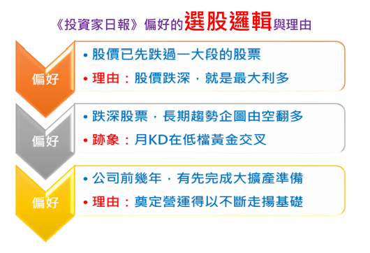 【偏好一】:股價已先跌過一大段的股票。理由:股價跌深,就是最大利多。