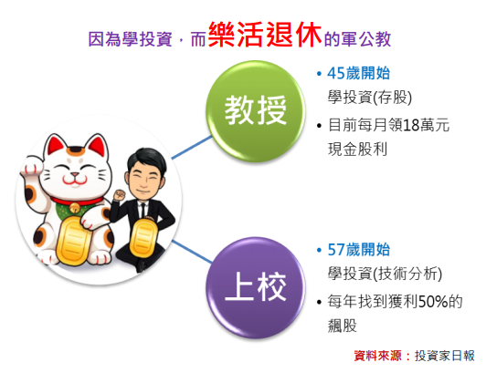 這幾年因為媒體職務的關係,慶龍接觸了不少理財達人,有小資族翻身的故事,也有到了中年才開始認真學投資的榜樣,其中讓慶龍印象深刻的,有兩位軍公教退休的達人,一個是大學教授,一個是退役的上校軍官,教授從45歲才開始學投資,而上校則是從57歲那一年,才決心要好好研究股票。