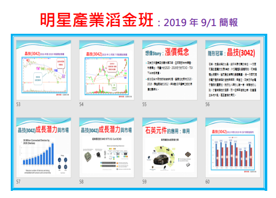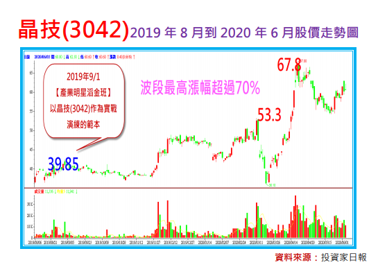由於課程設計長達三個月之久,因此慶龍會與同學經歷許多重大事件,例如中美貿易戰、7、8月除權息行情、Q2財報公布等等,即時且快速地反應行情的波動與變化。再者,我們也會將課堂所學的東西學以致用,舉例來說,去年9/1在Smart所舉辦的【明星產業滔金班】中,就以石英元件大廠晶技(3042),作為實戰演練的教學範本。