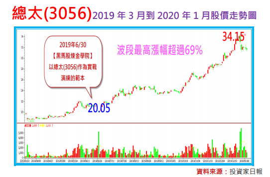欣慰的是,晶技(3042)後續表現也相當爭氣,股價一路從上課時的39.85元,漲到這一波最高價67.8元,波段最高漲幅達70%;類似狀況,同樣出現在去年6/30課程,透過合約負債選股,挖掘營建股總太(3056)的投資價值,並反應在股價從20.05元上漲69%來到今年1月最高34.5元的走勢上。