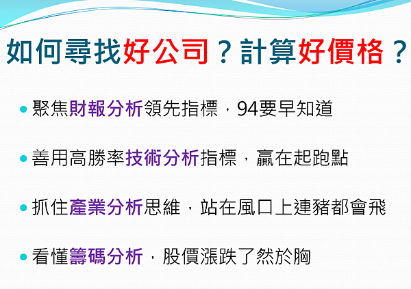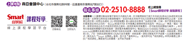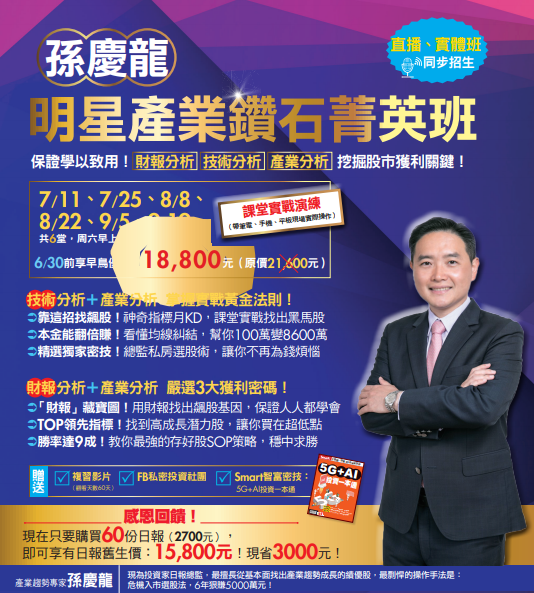 為了能讓大家能有系統的學習到投資的精隨,《Smart致富月刊》預計將在7/11、7/25、8/8、8/22、9/5、9/19,開設一系列包括技術分析、財報分析、產業分析、籌碼分析,並橫跨三個月的教學課程,六堂合計18小時的課程中,不僅提供慶龍與學員之間,有較多、較長時間,可以直接面對面互動的機會,主辦單位也提供6月底前的優惠價格,原價21,600元,早鳥價18,800元;歡迎有興趣的訂戶,洽詢客服專線(02)2510-8888。