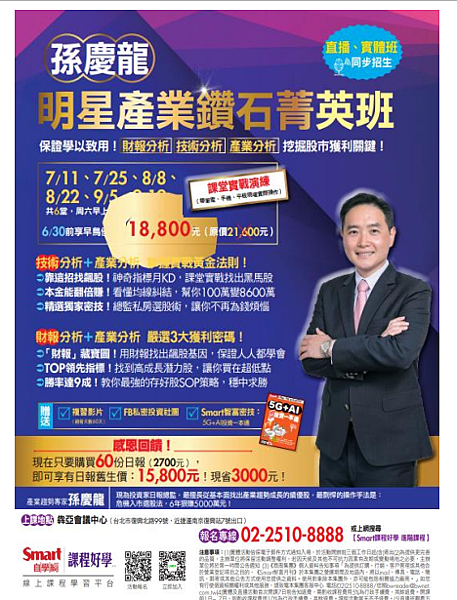 為了能讓訂戶更加了解日報的內容與精隨,《Smart致富月刊》預計將在7/11、7/25、8/8、8/22、9/5、9/19,開設一系列包括技術分析、財報分析、產業分析、籌碼分析,並橫跨三個月的教學課程,六堂合計18小時的課程中,不僅提供慶龍與訂戶之間,有較多、較長時間,可以直接面對面互動的機會,主辦單位也針對訂戶提供優惠價格,原價21,600元,早鳥價18,800元,日報訂戶價15,800元,相當於每小時只要878元;歡迎有興趣的訂戶,洽詢客服專線(02)2510-8888。