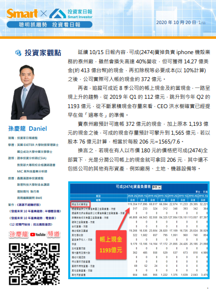 賣泰州廠預計可進帳372億元的現金,加上原本1,193億元的現金之後,可成的現金存量預計可攀升到1,565億元,若以股本76億元計算,相當於每股206元=1565/7.6。