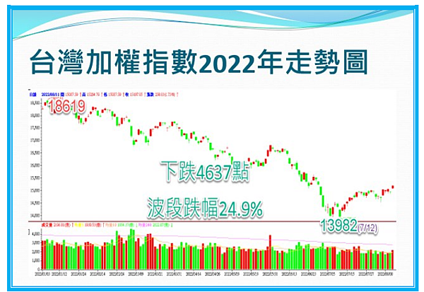 顧2022年1月到8月以來的台股走勢,年初時在許多市場分析認為今年會上2萬點的樂觀氛圍中,台股卻從1月時的最高點18619開始悄悄滑落,並經歷過去32年以來最慘烈的上半年跌點,7/12甚至一度跌破萬四,最低來到13982,波段跌點不僅高達4637點,波段跌幅也達24.9%。