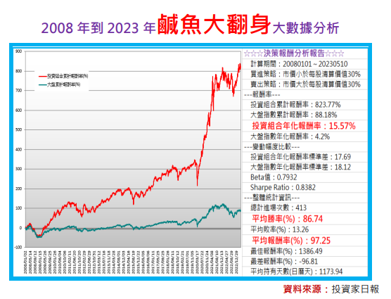 慶龍所主張的這一套「鹹魚大翻身」的投資策略,不僅已成功運用在2011年以來日報許多追蹤標的成功經驗上,即使套用在台股所有符合資條件的標的上,一樣也可以創造通過大數據分析,且結果令人印象深刻的績效表現。
