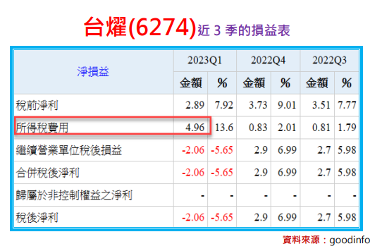 檢視今年Q1的財報,台燿的稅前淨利為2.89億元,若依照前兩季所得稅率約在23%計算,應繳的所得稅約在0.66億元,扣除後的稅後淨利約在2.23億元,再除以2.692億發行股數,EPS約落在0.82元;然而,由於今年Q1所得稅暴增到4.96億元,因此也導致稅後淨利掉到約負2.06億元=2.89-4.96,單季EPS由盈轉虧到負0.77元。