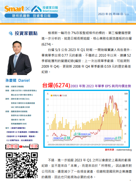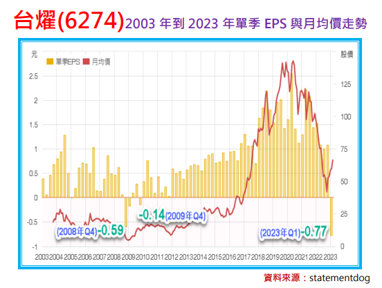 台燿5/3公告2023年Q1財報,一開始確實讓人有些意外,畢竟單季出現0.77元的虧損,不僅終止2010年以來,連續52季都能獲利的營運紀錄(編按:上一次出現單季虧損,可追溯到2009年Q4),更刷新2008年Q4單季虧損0.59元的歷史最差紀錄。